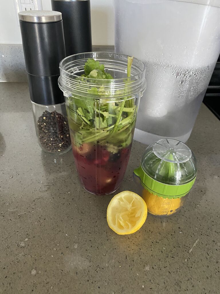 冷凍ベリー、生姜、ターメリック(ウコン)、ブラックペッパー、レモン、パクチー、水。