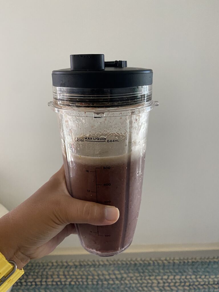 ホエイプロテイン、バナナ半分、冷凍ベリー、お水たっぷり、カカオとゴジベリーとアサイーのパウダー。