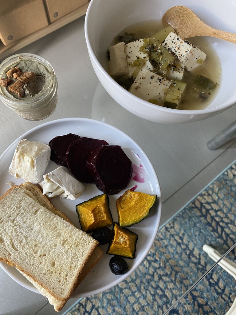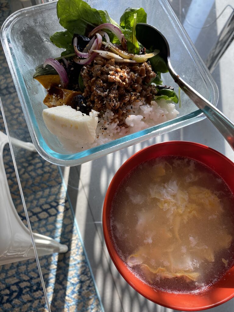 昨日の朝ごはんは、冷やご飯+野菜+チーズと納豆に、卵スープ〜