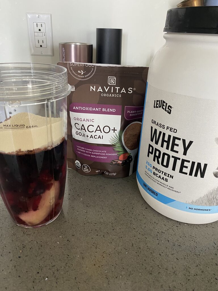 バナナ、ベリー、カカオパウダー、グラスフェッドのホエイプロテイン。