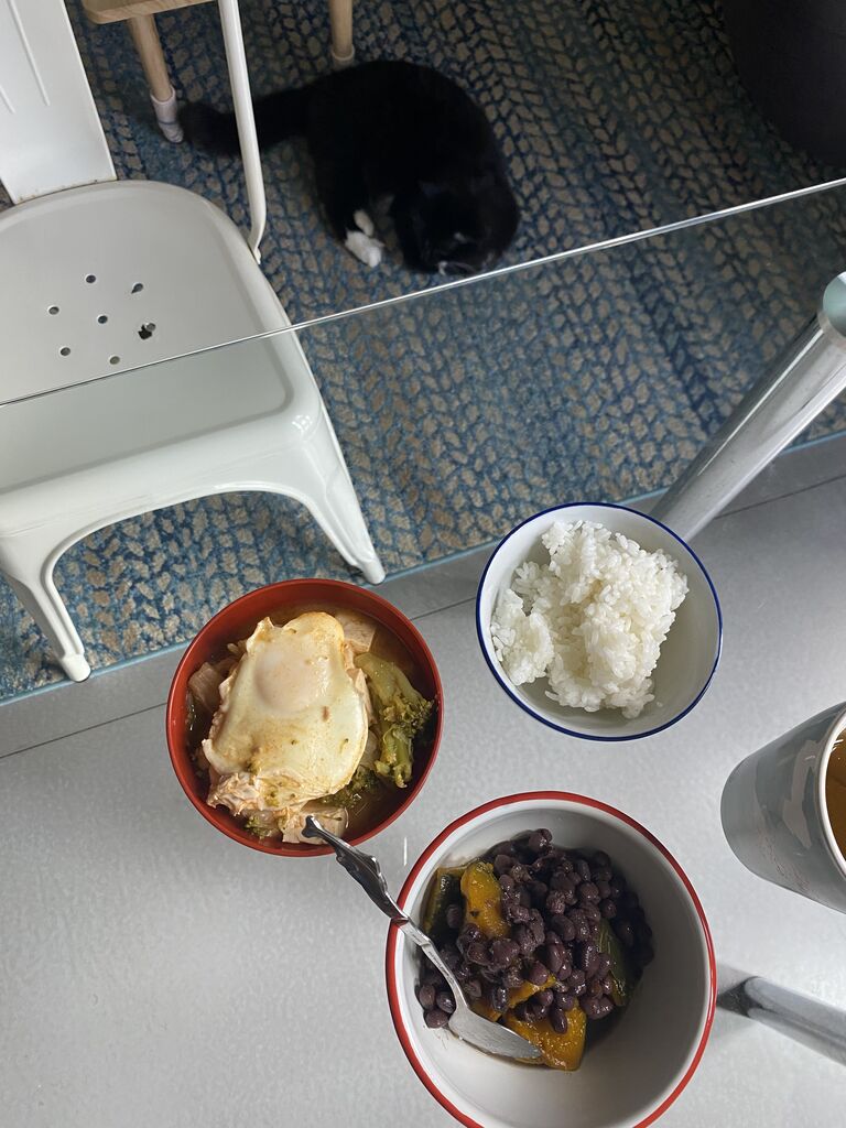 白米、野菜たっぷり味噌汁+平飼い卵、小豆とカボチャ。