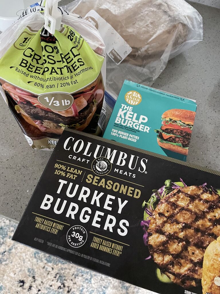 グラスフェッドビーフ、ケルプバーガー、ターキーバーガー。