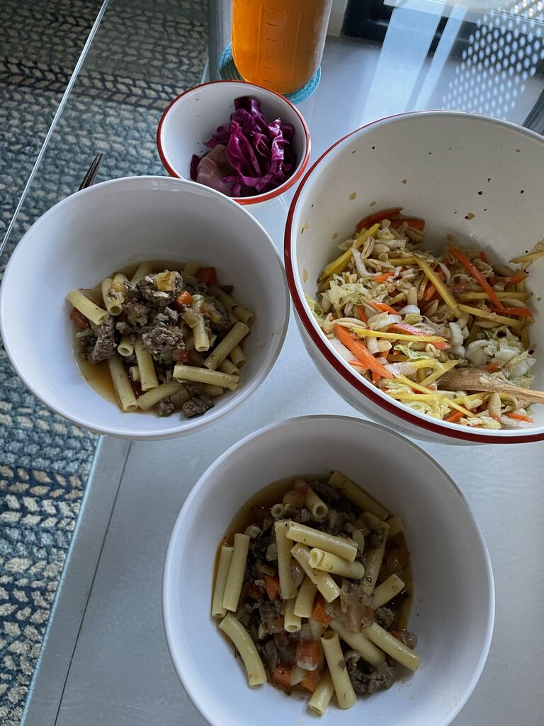 ディナーは、スイカをカットしたのでその白いところとグラスフェッド牛でミートソース。