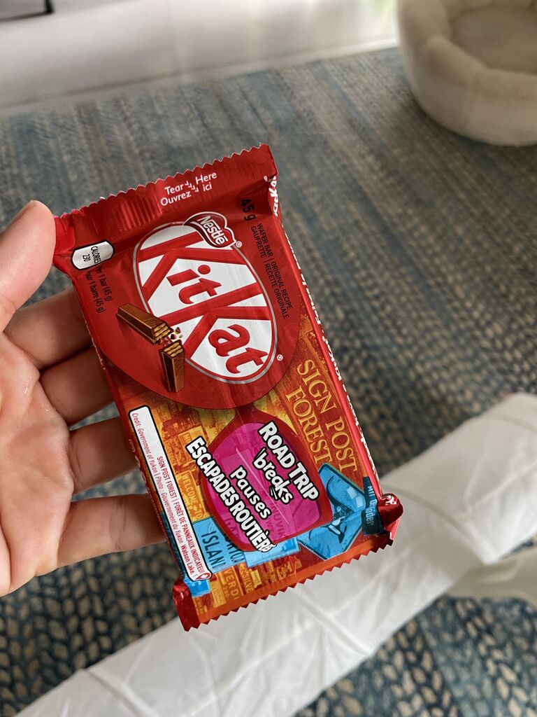 夫がカナダからの飛行機でもらったらしいキットカットを半分こ。