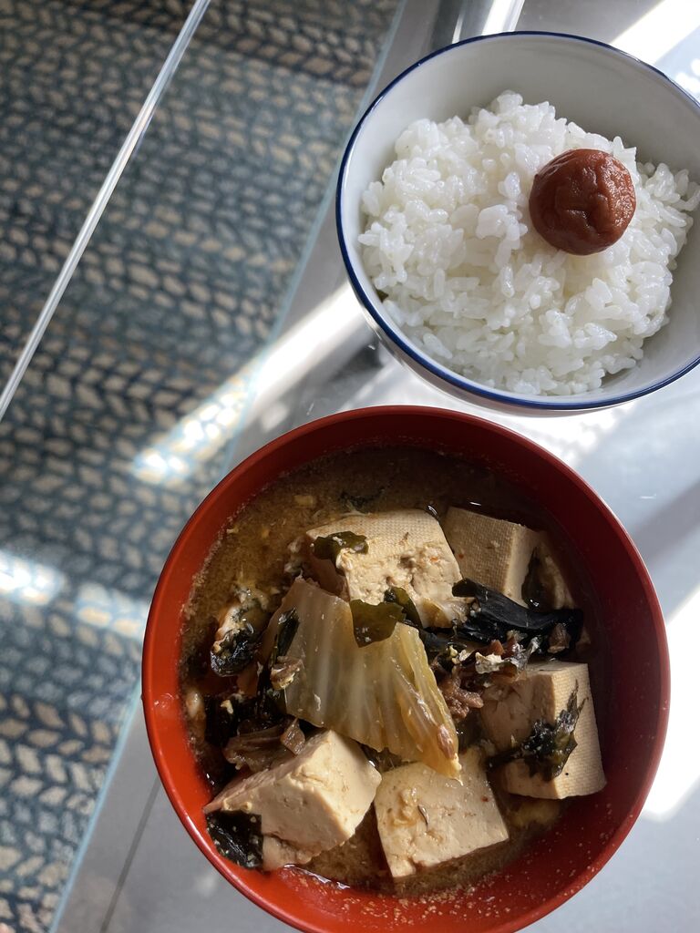 炊き立て白米+梅干しに、干しキノコとわかめ、豆腐、キムチのスープ。