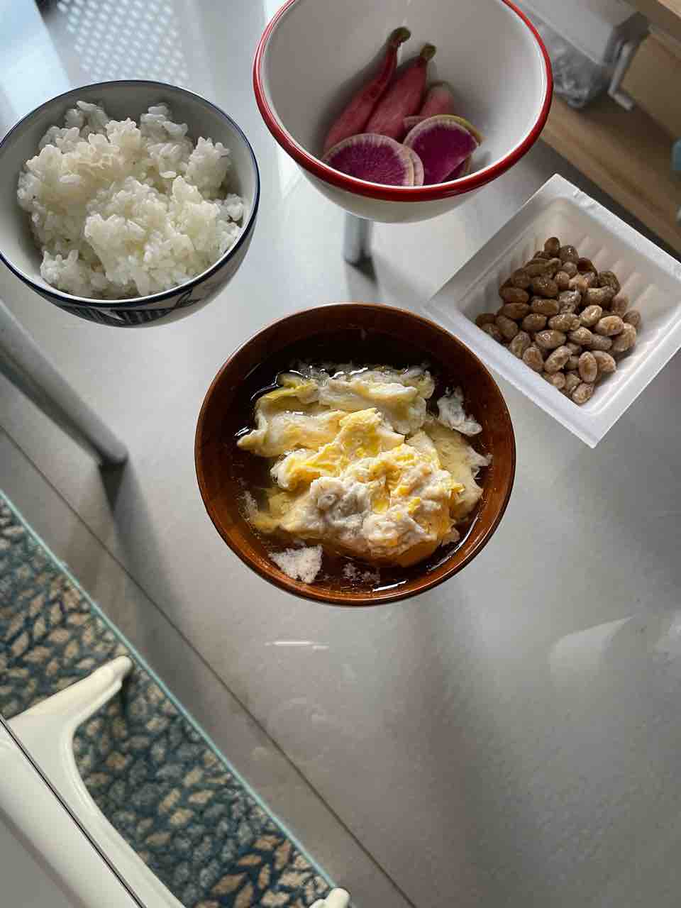 昨日の朝ごはんは、チキンボーンブロスに卵と豆腐のスープ、納豆、白米、糠漬け、浅漬け!
