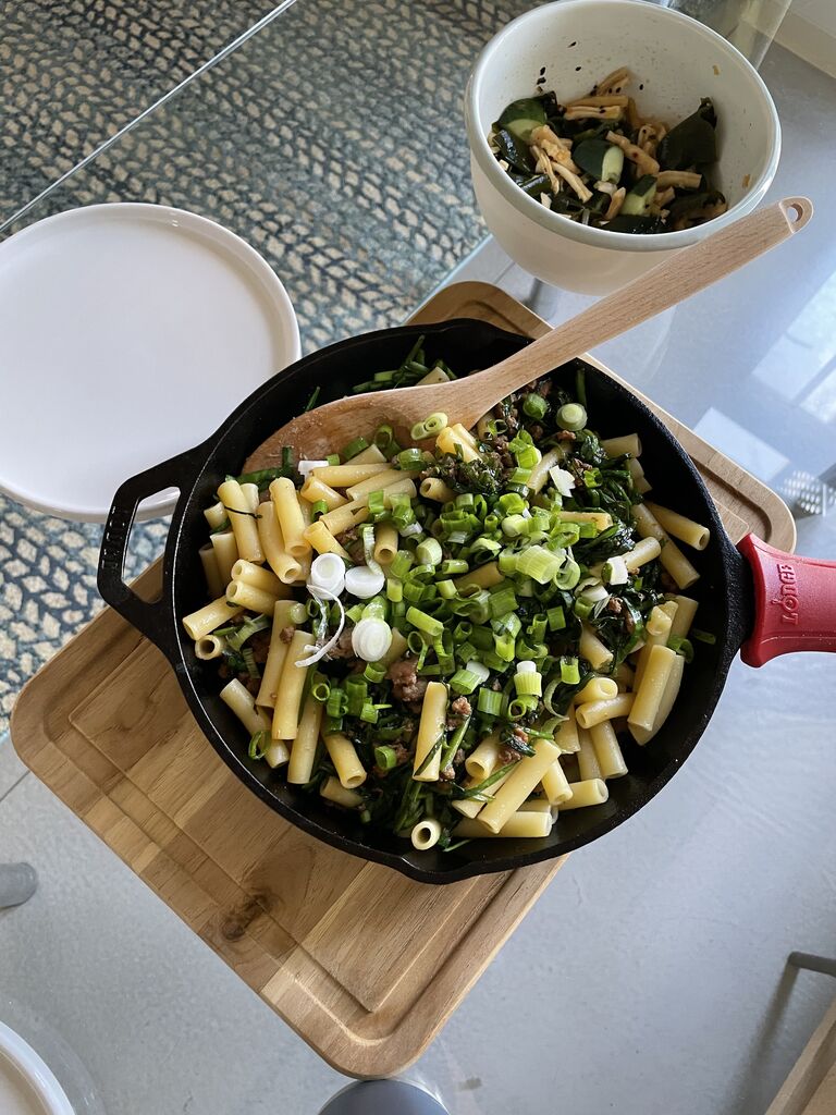 夕食は、クアロアランチの豚ひき肉とニラのパスタ。