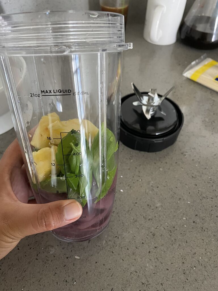 帰ってきてアサイー、バジル、パイナップルのスムージー。