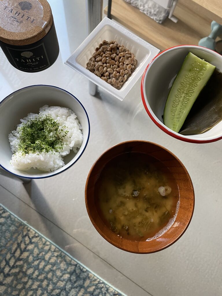 昨日の朝ごはんは納豆、白米、味噌汁、糠漬け!