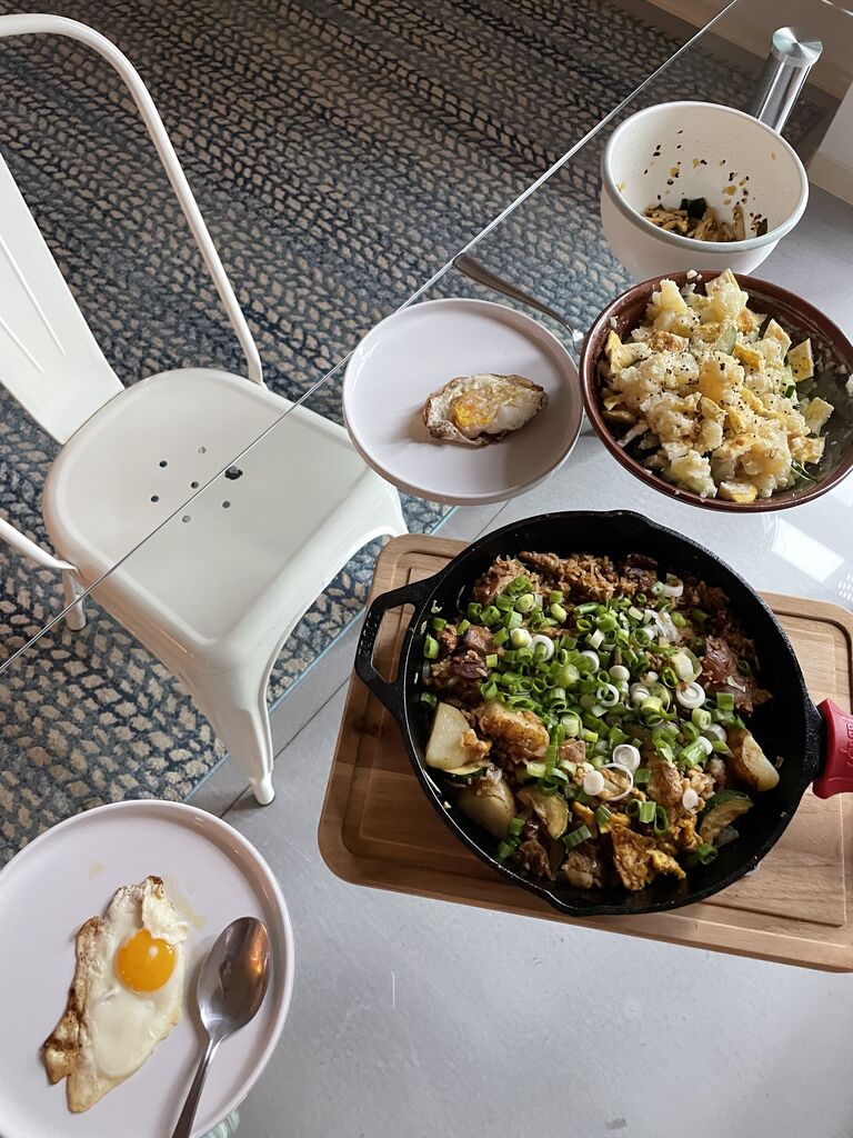 さて、ディナーは目についた野菜や卵を全部スキレットに入れて炒めたものが半分と、もう半分はご近所さんにもらったチキン炒飯?です。それに卵と、ポテトサラダと、切り干し大根のサラダ。