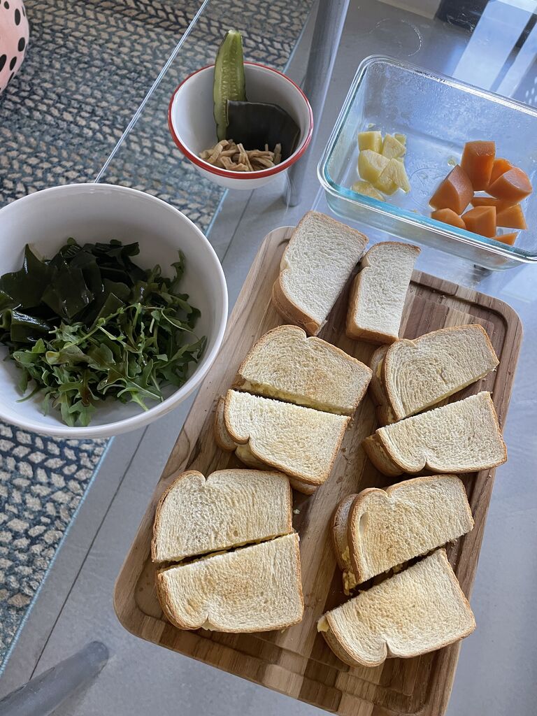 「パンと卵とマヨネーズを使い切りたい」がテーマで卵サンドでした。
