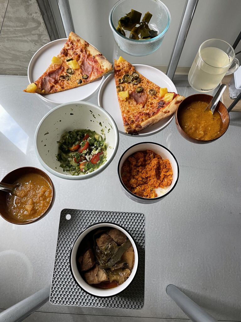 ピザに、残り物達!(わかめの酢の物、サラダ、豚肉煮込み)