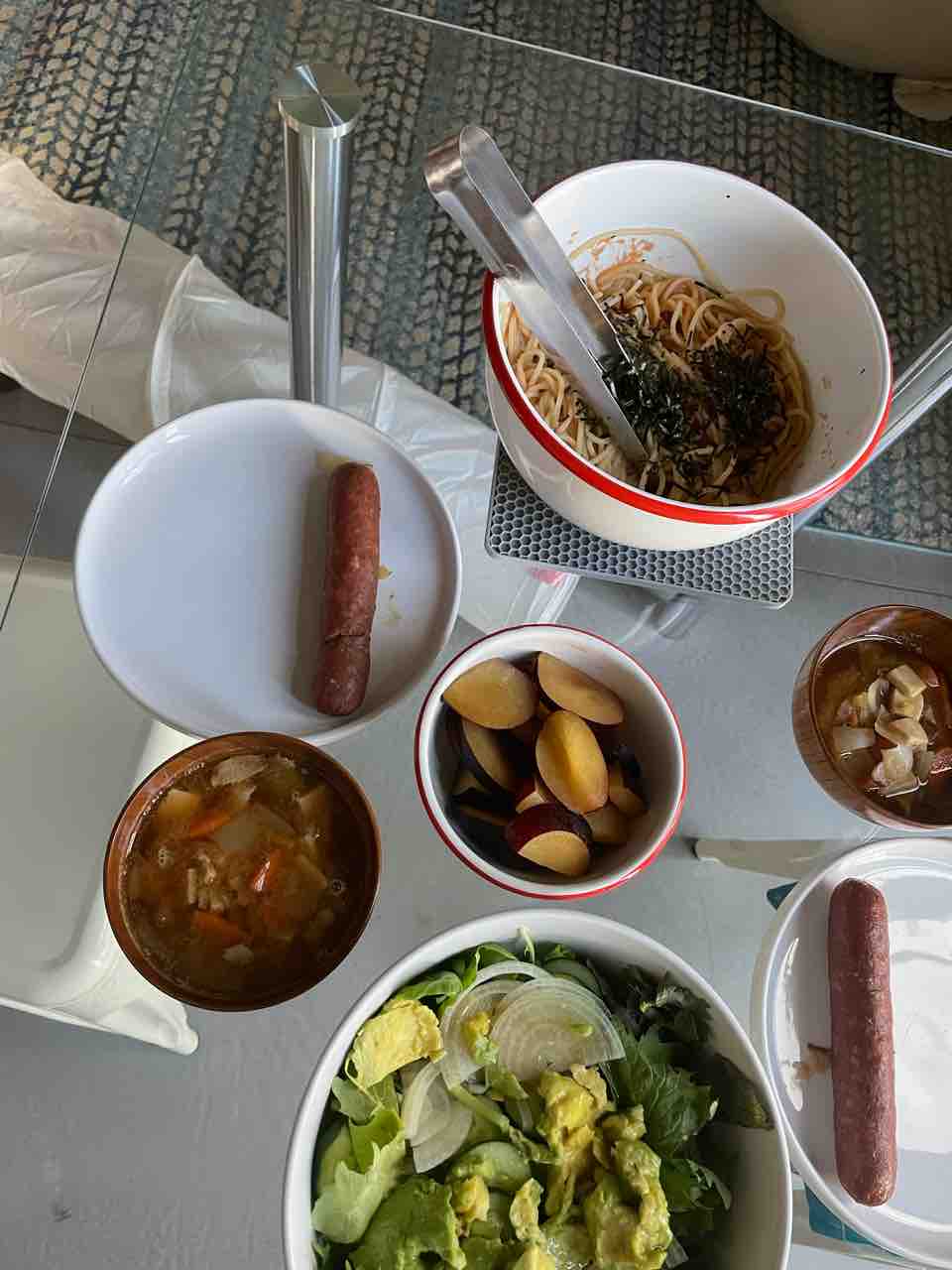 サラダと具沢山味噌汁、プラム、グラスフェッドビーフのソーセージ。