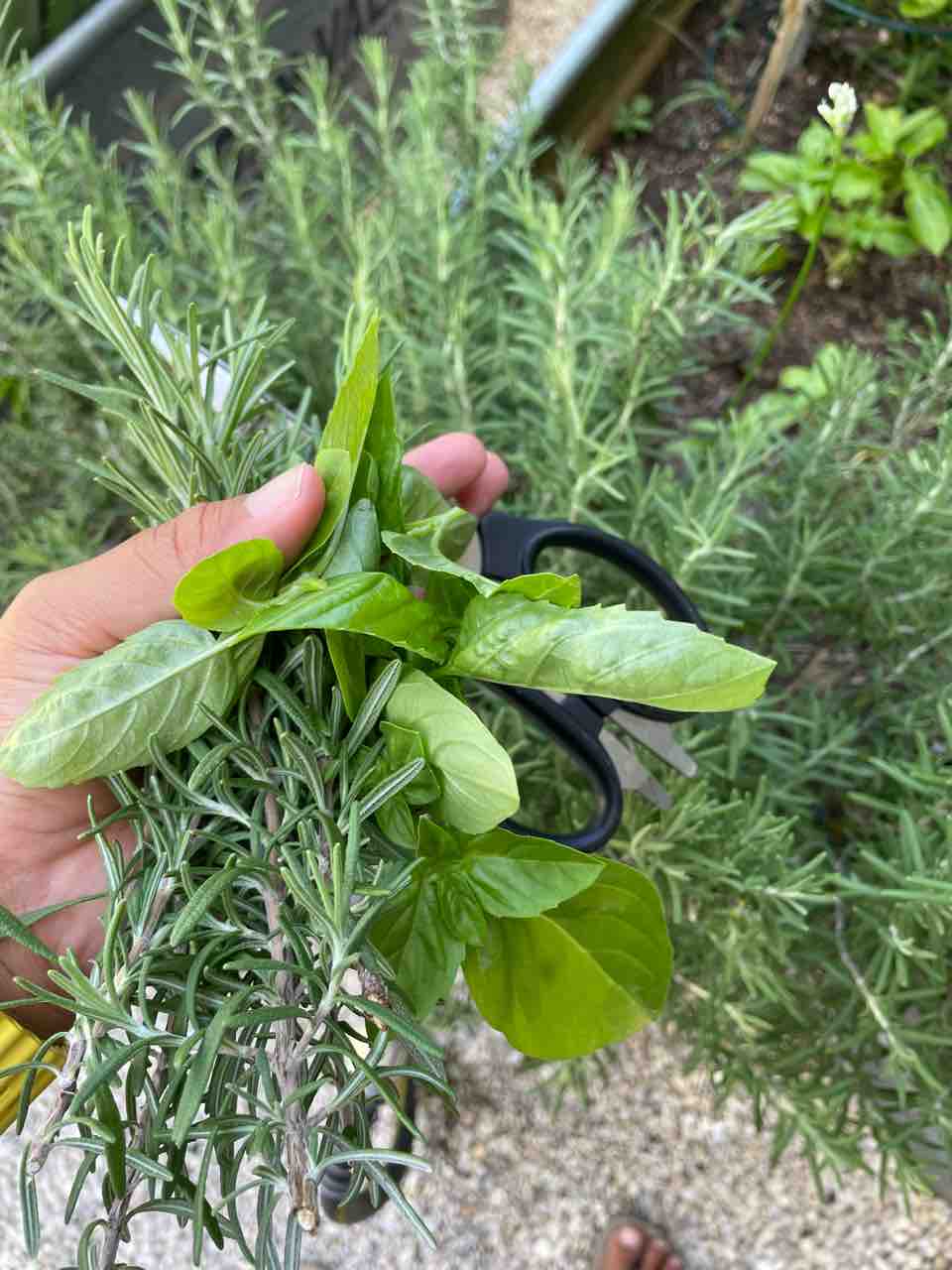 私はローズマリーとバジルを収穫。