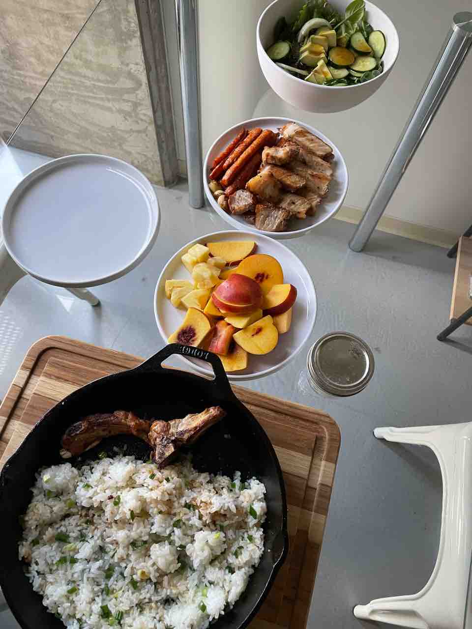 ディナーはサラダと、豚肉とにんじん、ネクタリン、グリーンオニオンライス!