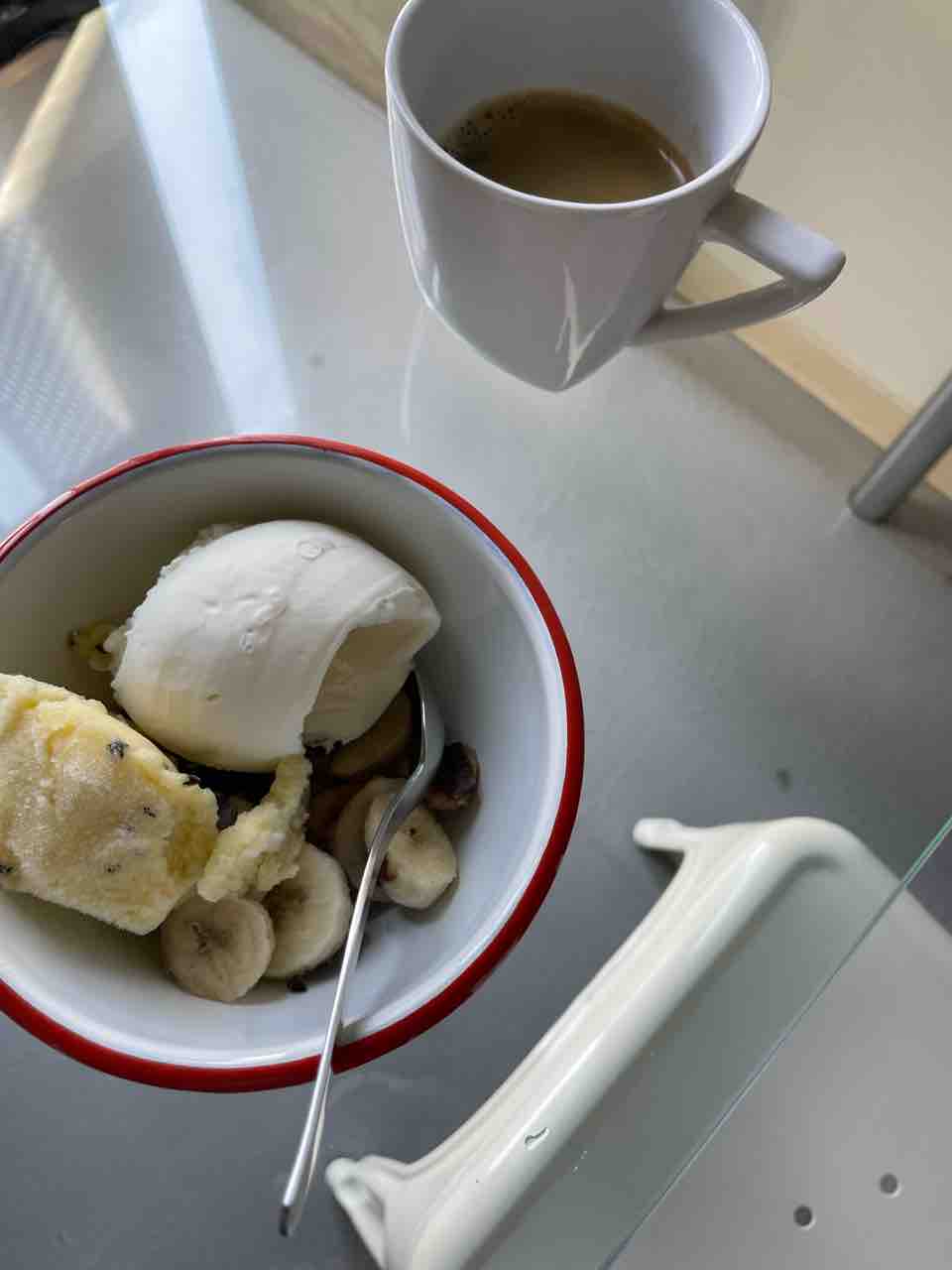 おやつに、コーヒーと、ハニーヨーグルトジェラートに、リリコイソルベ。冷凍チョコバナナ。