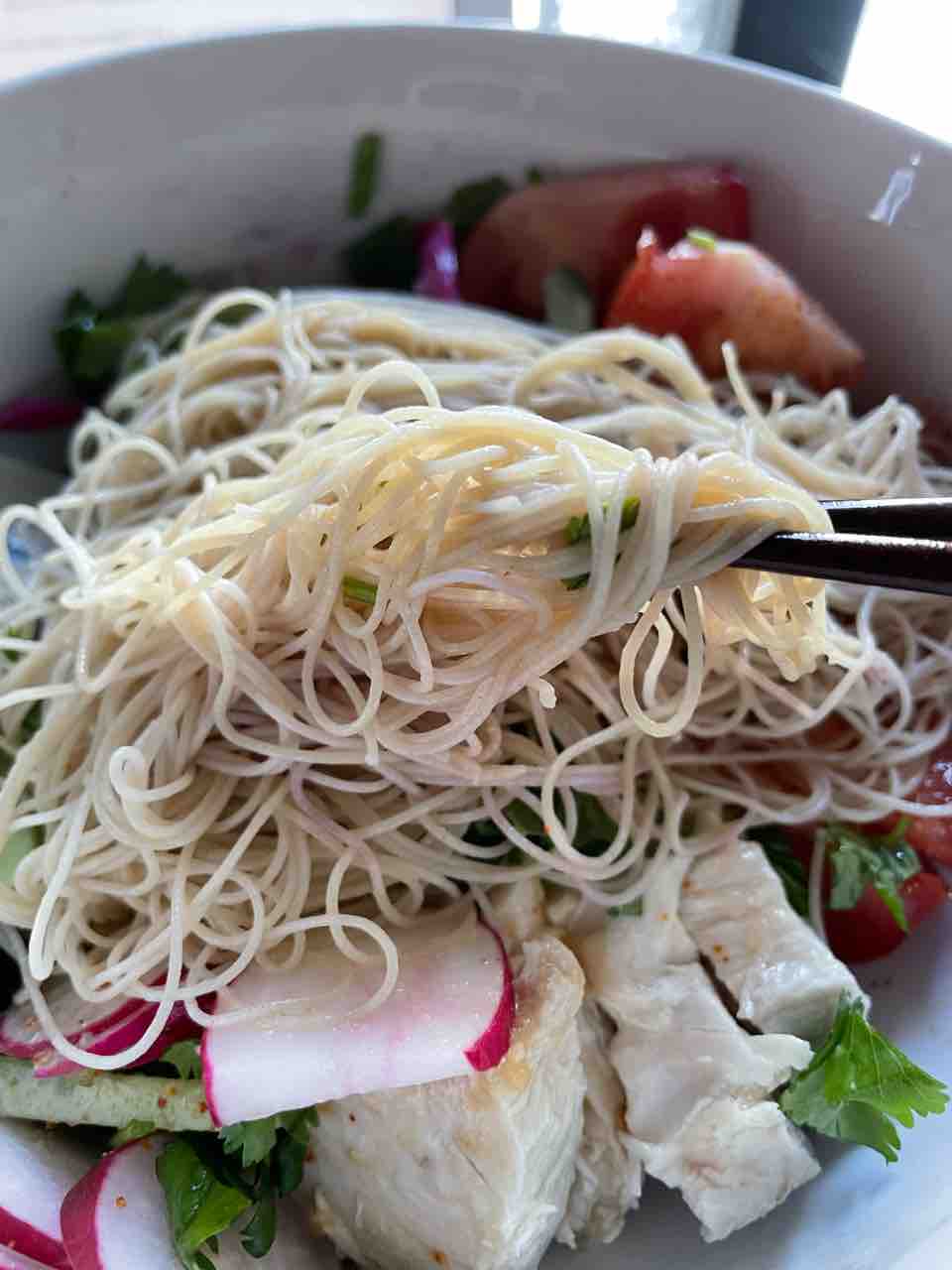 ランチはライスヌードルに野菜いろいろと、茹で鶏胸肉。