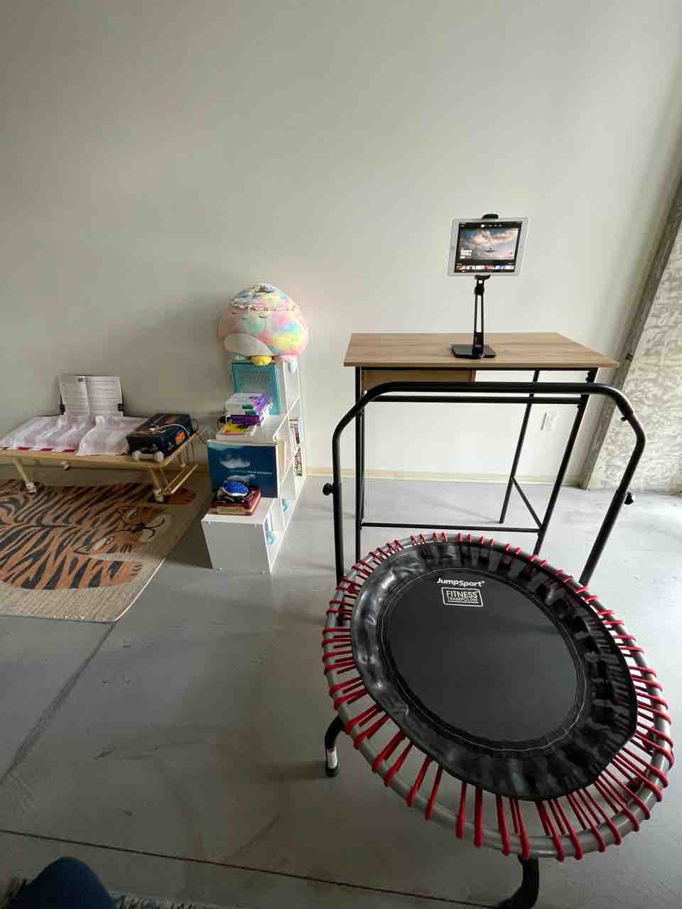 とりあえずトランポリンをちょっと跳んでみた。(ずっと物置になってた)