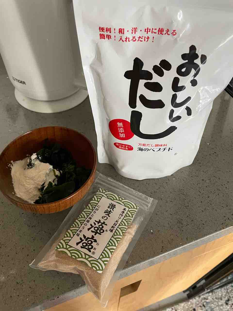 スープは出汁パウダーと、わかめと藻塩にお湯を注いだだけ。
