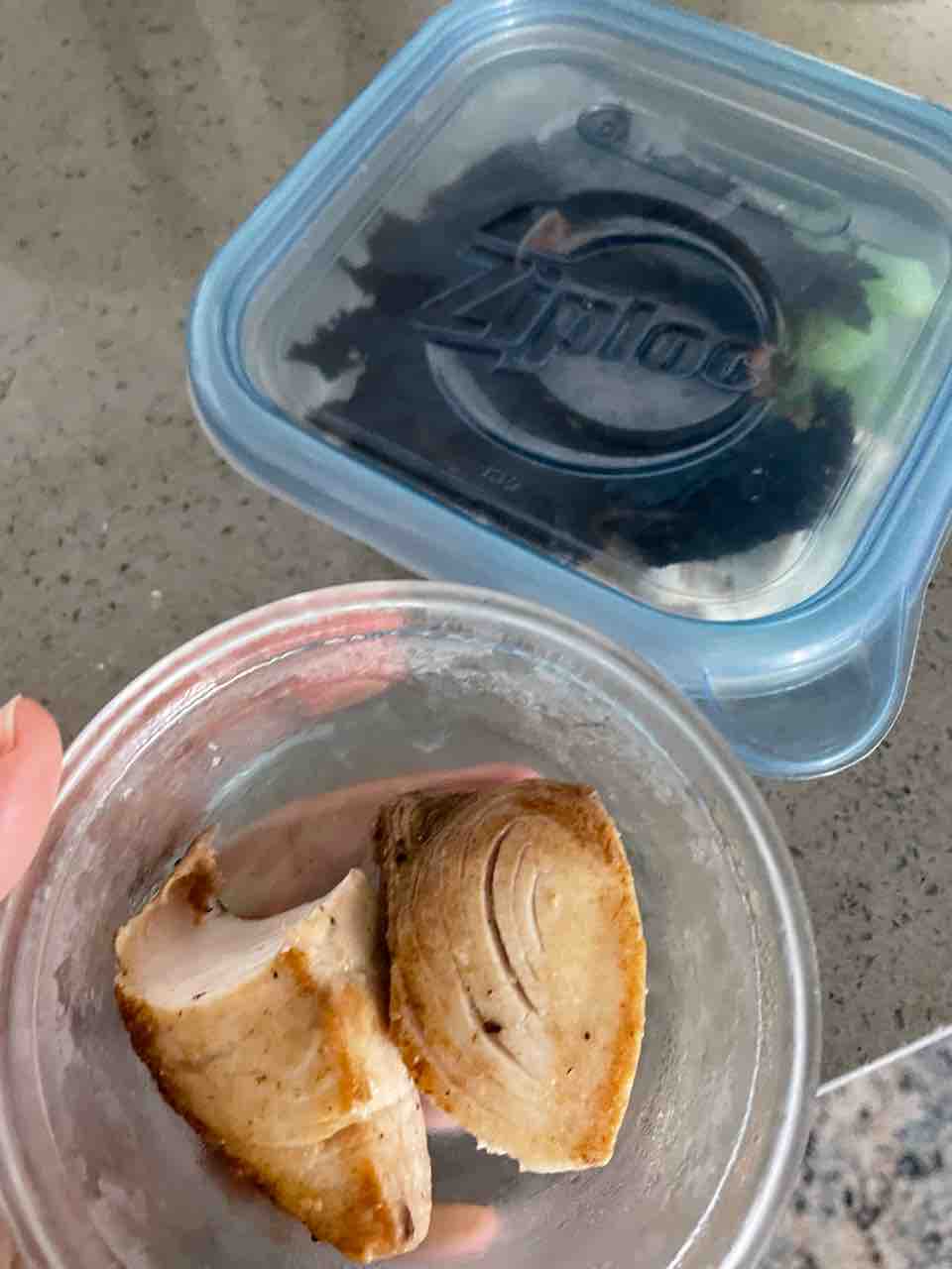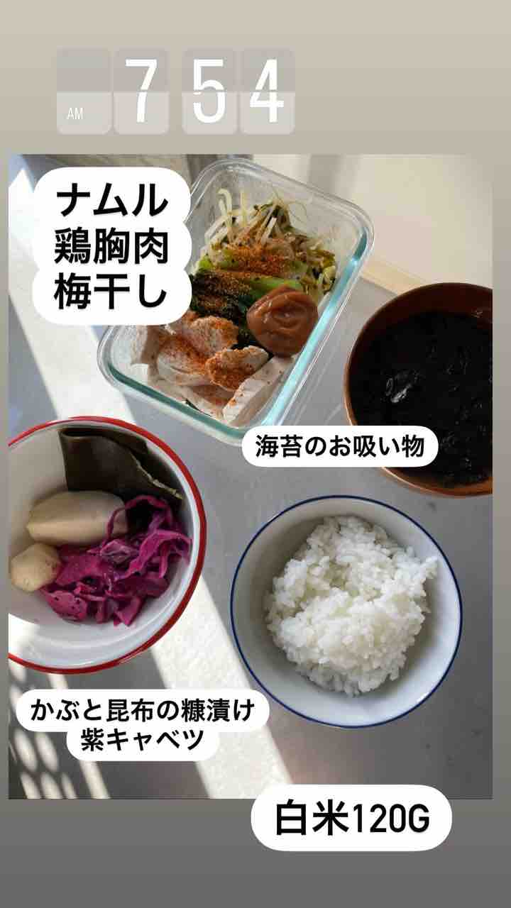 朝ごはん。鶏胸肉と、野菜と、白米120g。