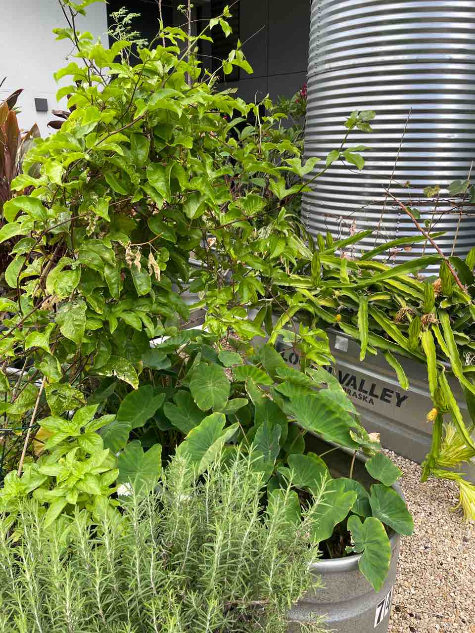 バジルも元気に育ってたし、奥のリリコイも伸び放題さ…!