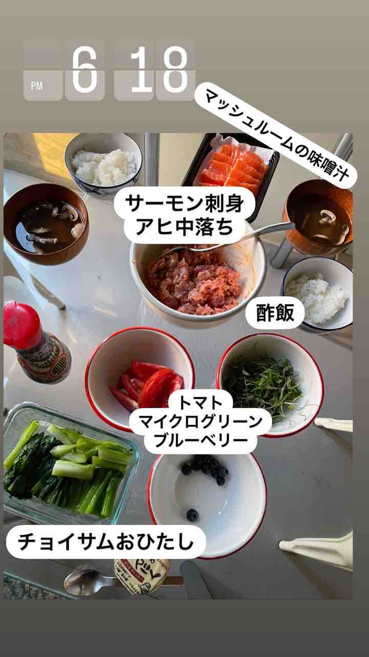 お味噌汁に、酢飯、サーモンとアヒ、トマト、チョイサムのおひたし、マイクログリーン、ブルーベリー。