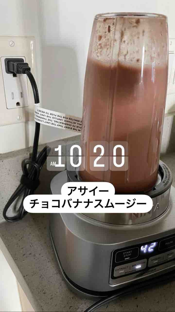 バナナ半分に、パイナップルの芯、アサイーキューブ少し、カカオーパウダーで100キロカロリー以下!