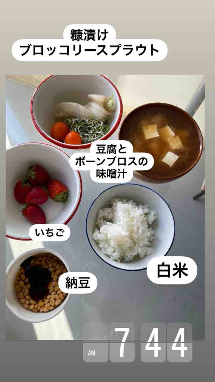 納豆、味噌汁、糠漬けとブロッコリースプラウト、いちご。