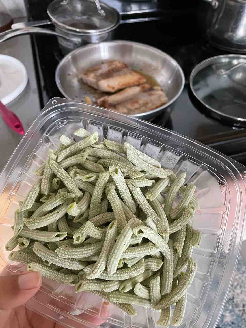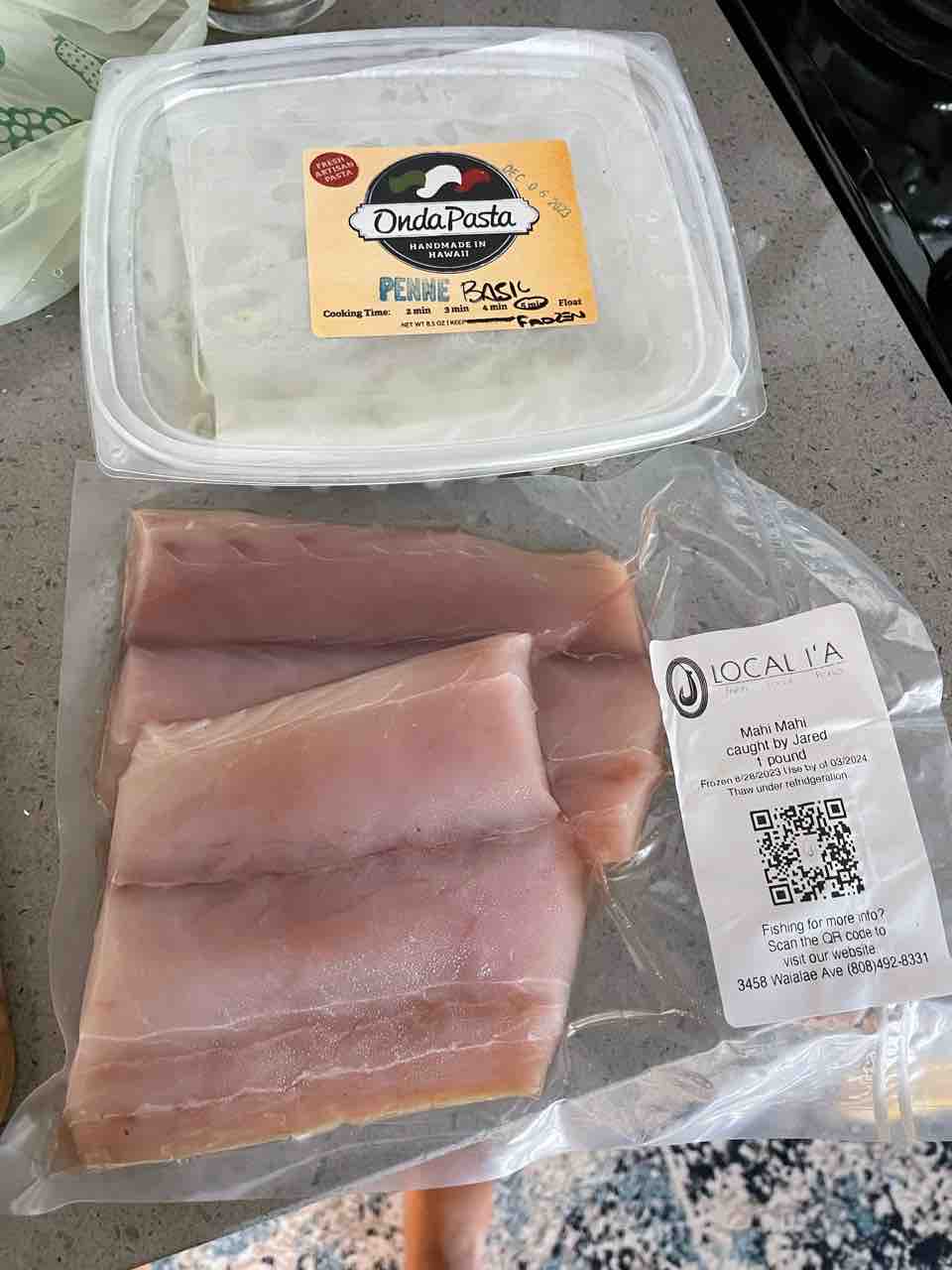 バジルの練り込んであるオンダパスタとマヒマヒ。