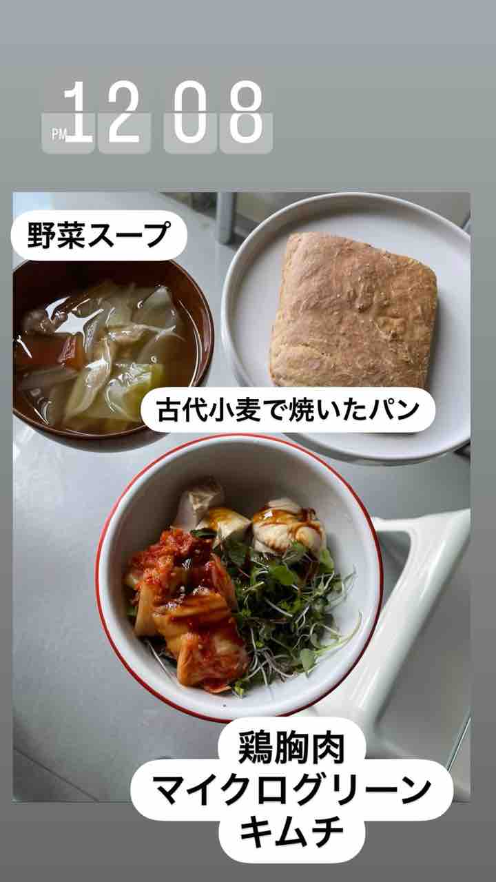 昼ごはんは野菜スープと、冷凍庫に忘れ去られていた自分で焼いた古代小麦のパン(見た目に反してめちゃくちゃ美味しい)、鶏胸肉、マイクログリーン、キムチ。
