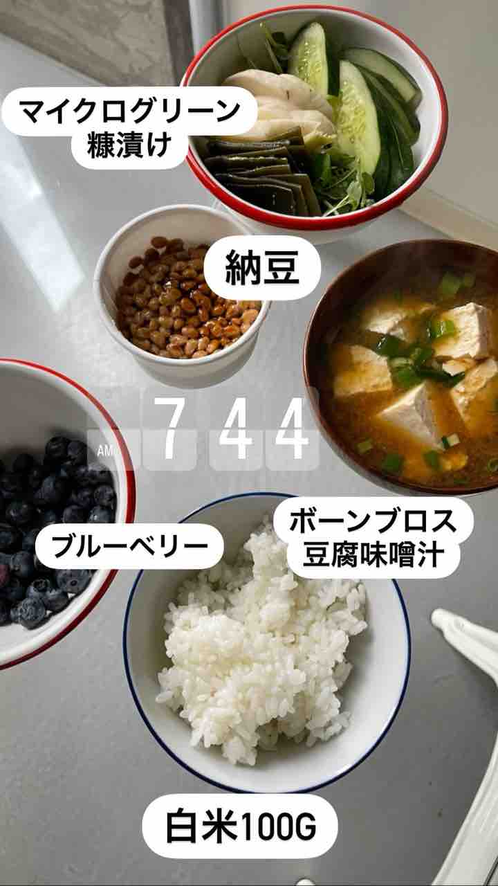 糠漬けとマイクログリーン、納豆、ボーンブロス味噌汁、白米、ブルーベリー!