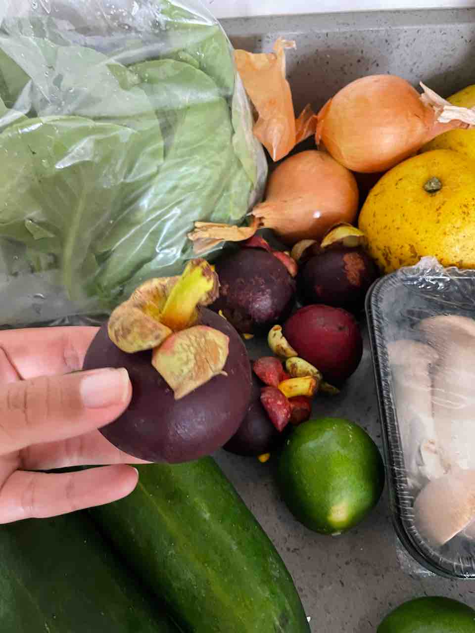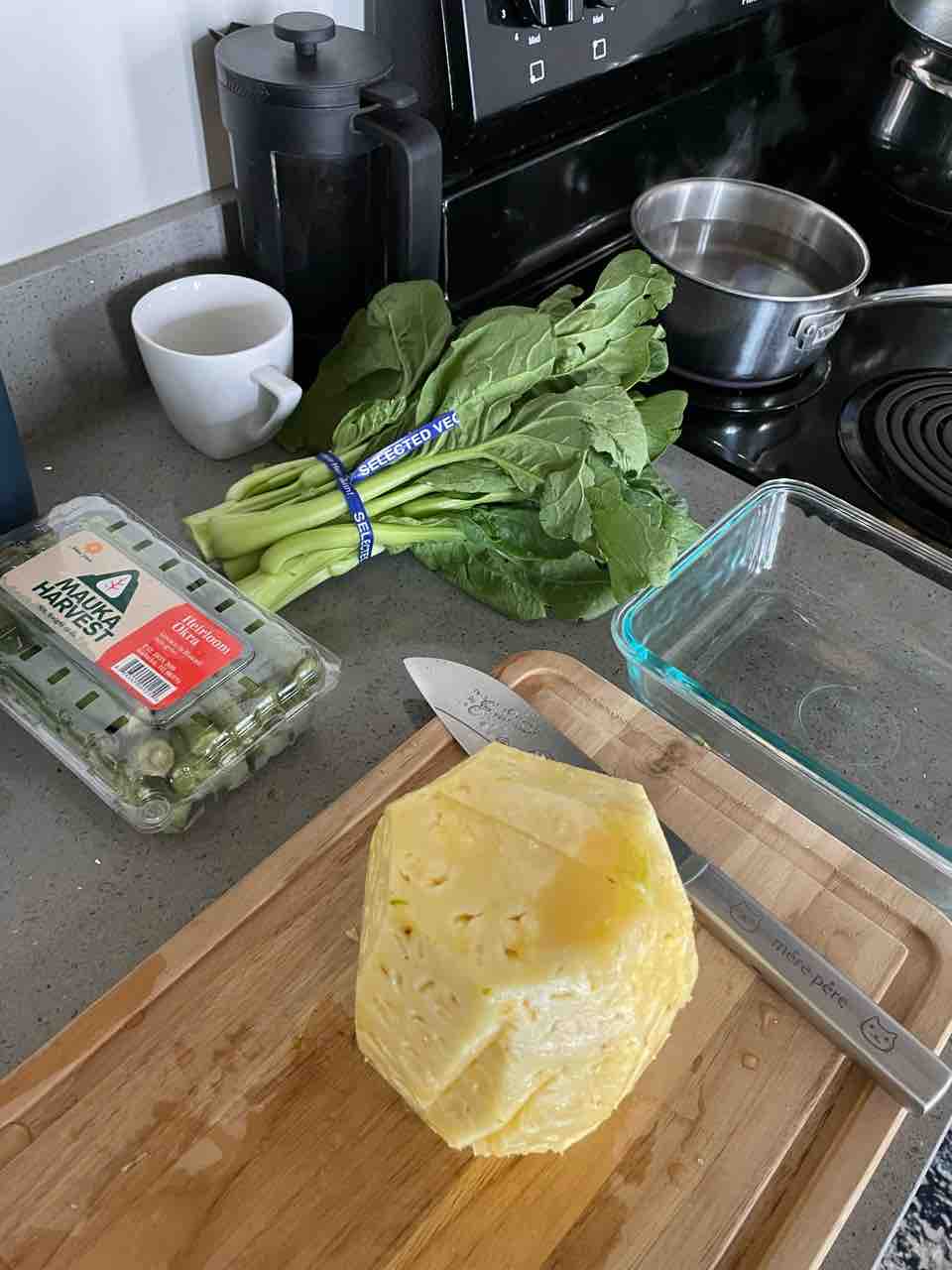 早速パイナップルはカットして、チョイサムとオクラは湯掻いて下ごしらえ。