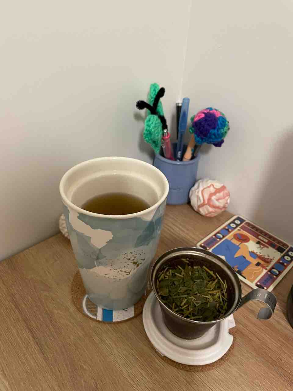 朝は緑茶。残ってた茶葉全部入れたら、すごい量になった🤣