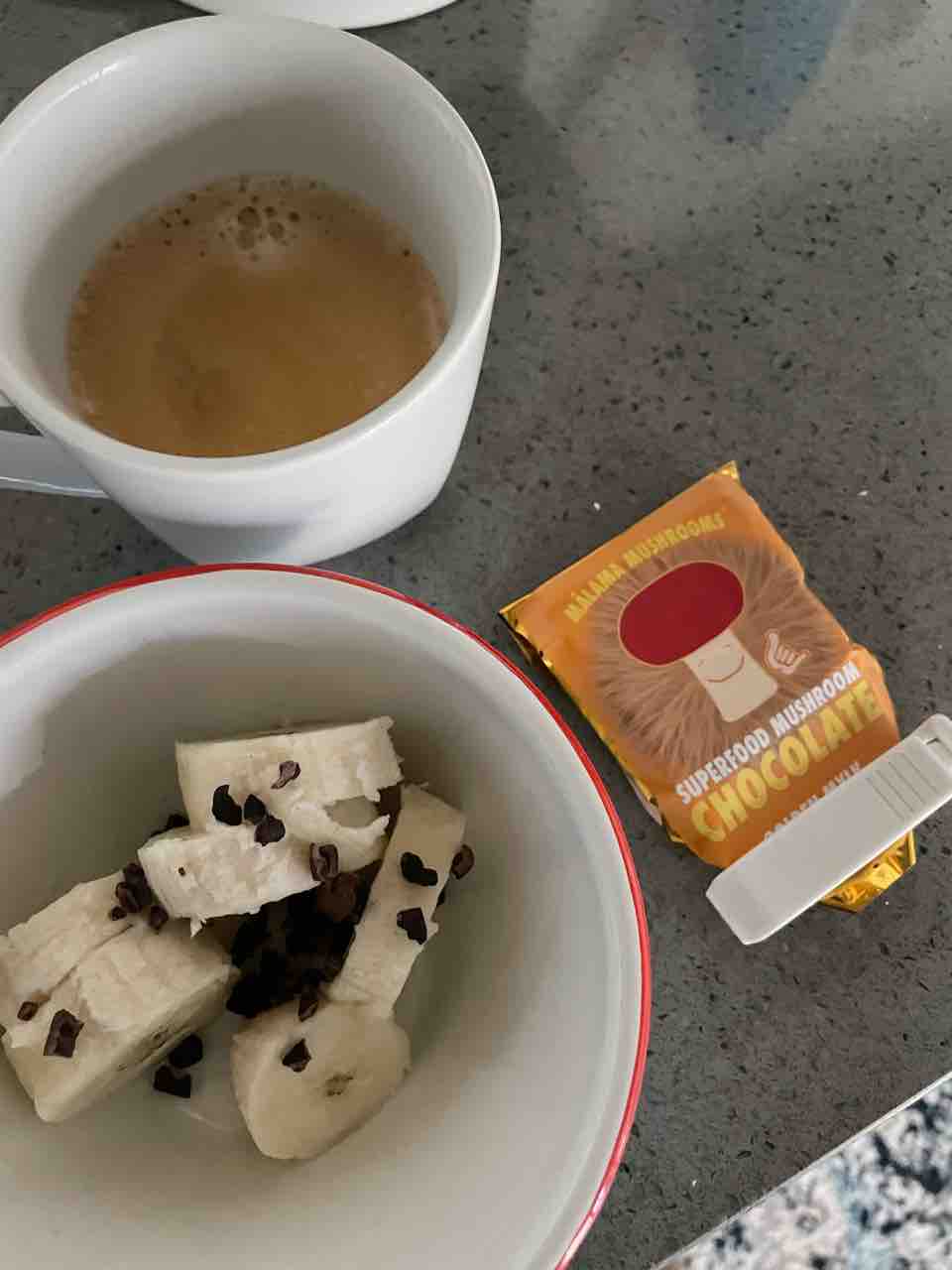 それにカカオニブとブラックコーヒー、キノコ入りチョコレート1かけ。