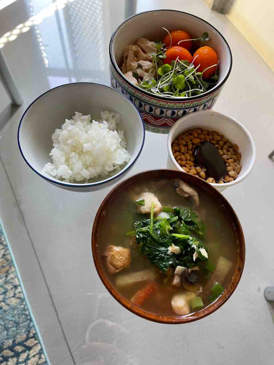 鶏胸肉と野菜に、納豆、野菜スープ、白米80g。