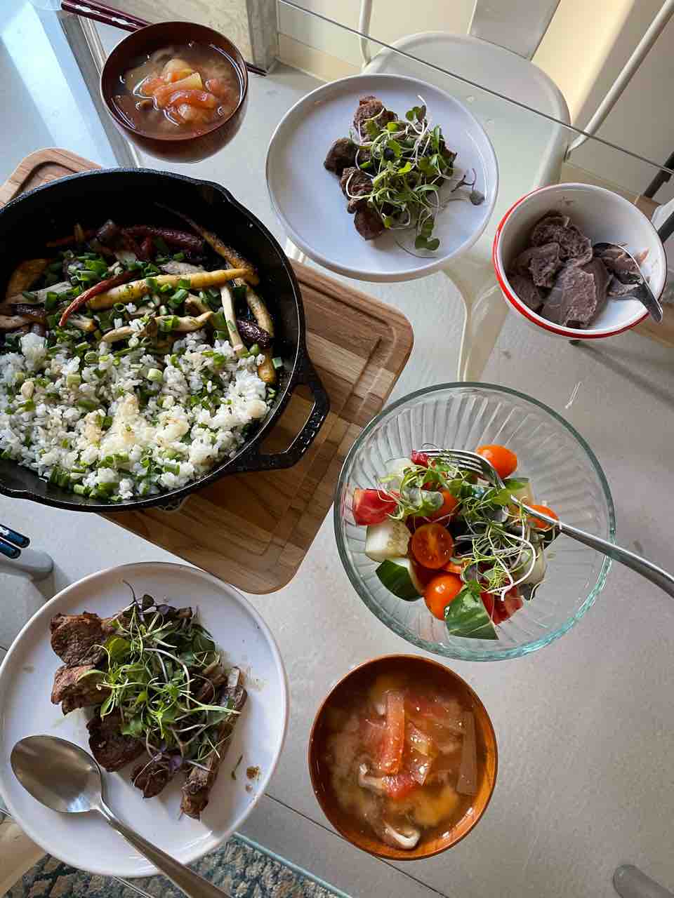 あとはスイカの白いところの味噌汁と、野菜炒め、野菜サラダ。