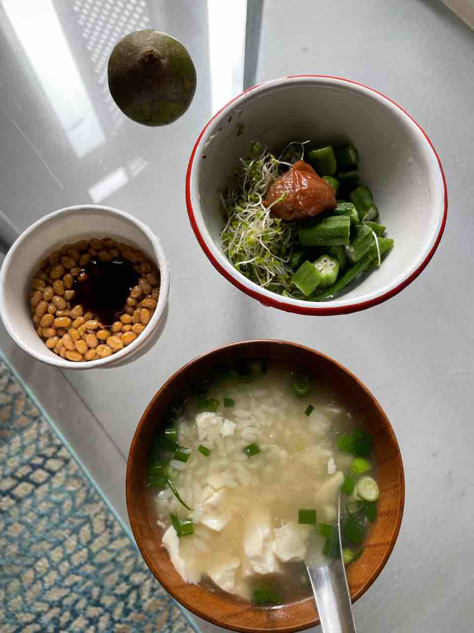 それにローカルのみかん、納豆、オクラとブロッコリースプラウト、梅干し。