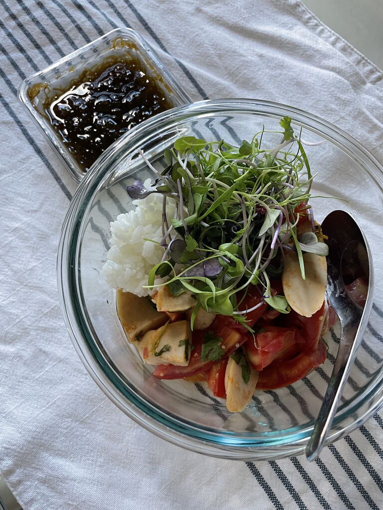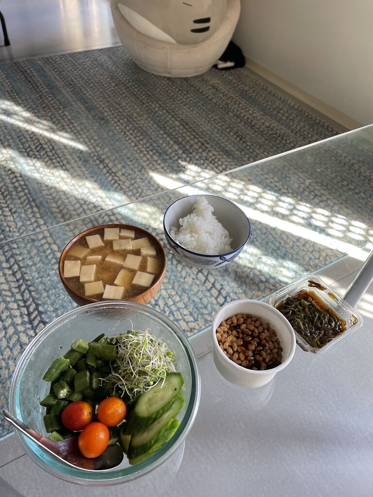 ボーンブロスと豆腐の味噌汁に、白米100g、オクラとブロッコリースプラウトに糠漬けとミニトマト、納豆、めかぶ。