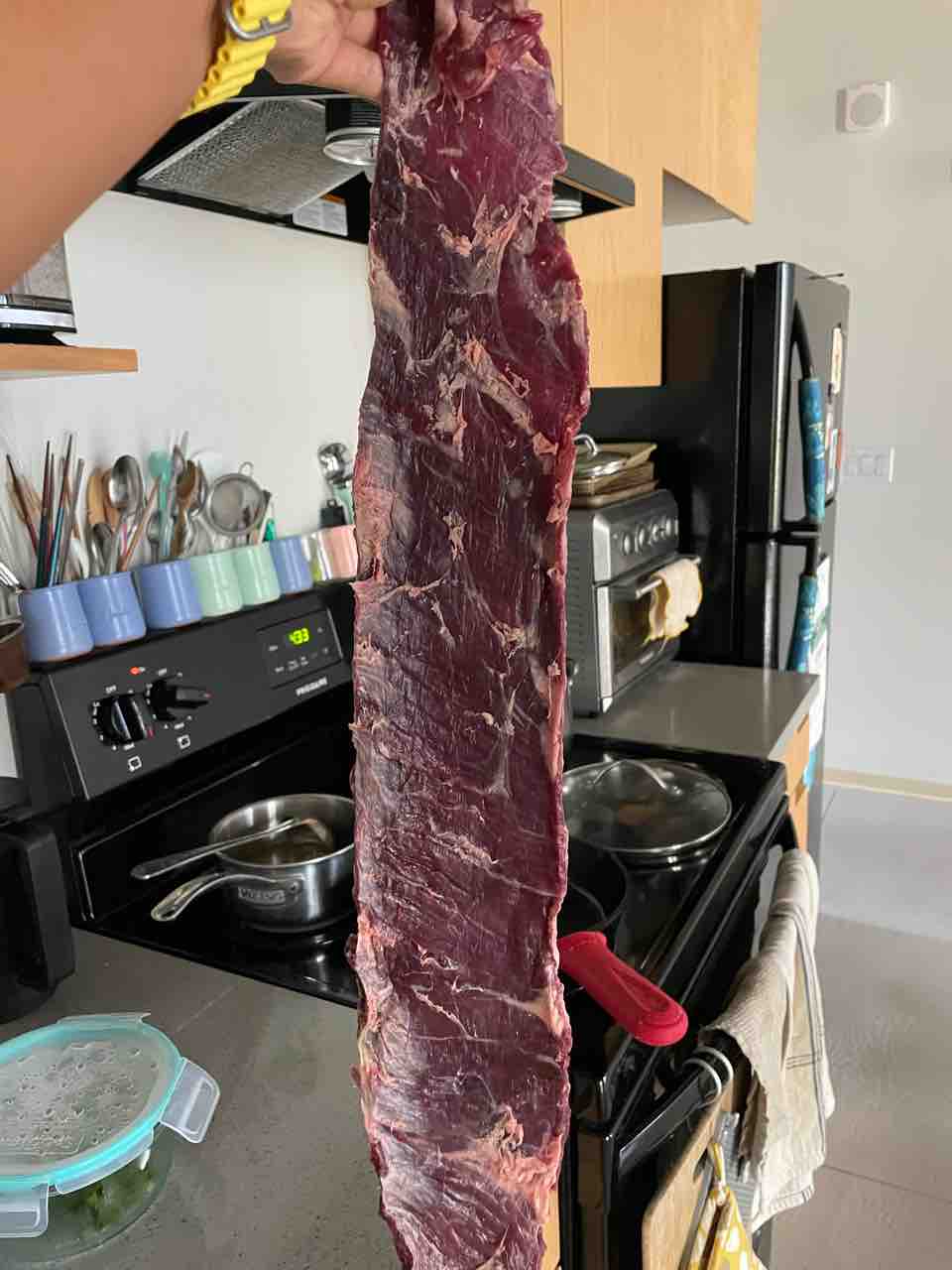 Skirt steakっていう部位なんだけど、この大きさで0.9パウンド(400gぐらい?)!
