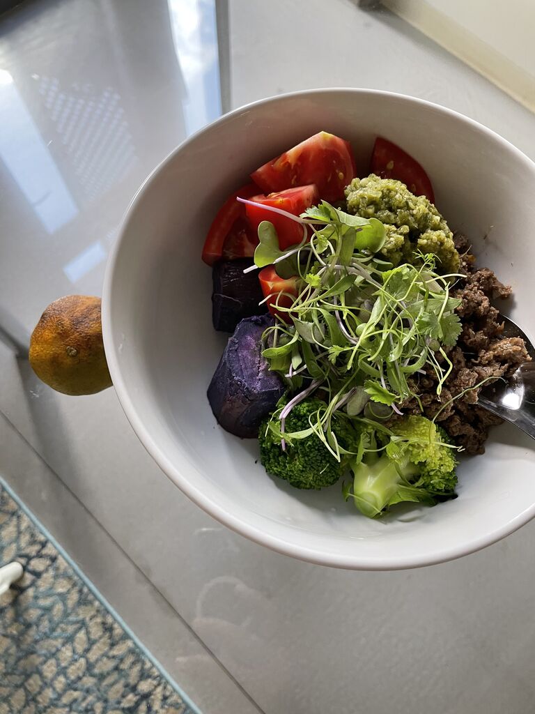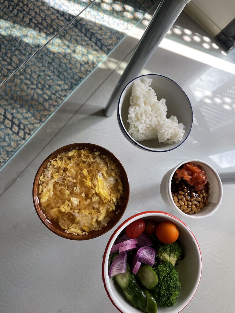 白米100g、ボーンブロスとカモ卵の味噌汁、納豆にイカ明太子、ブロッコリーと糠漬け、スプラウト、ミニトマト。