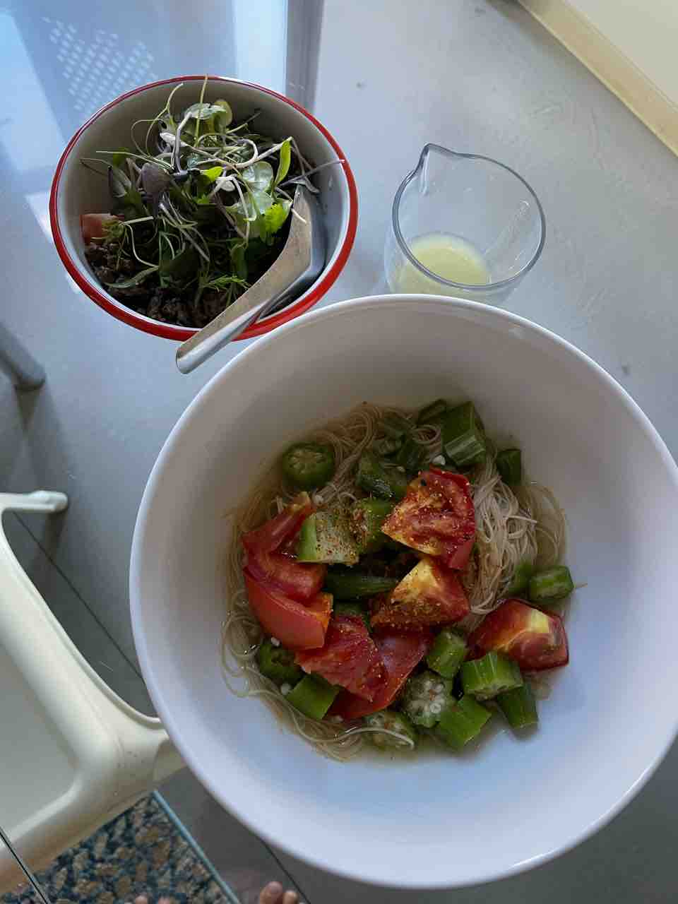 冷凍オクラとトマトとチキンストックのスープに米麺。途中、ライムで味変!