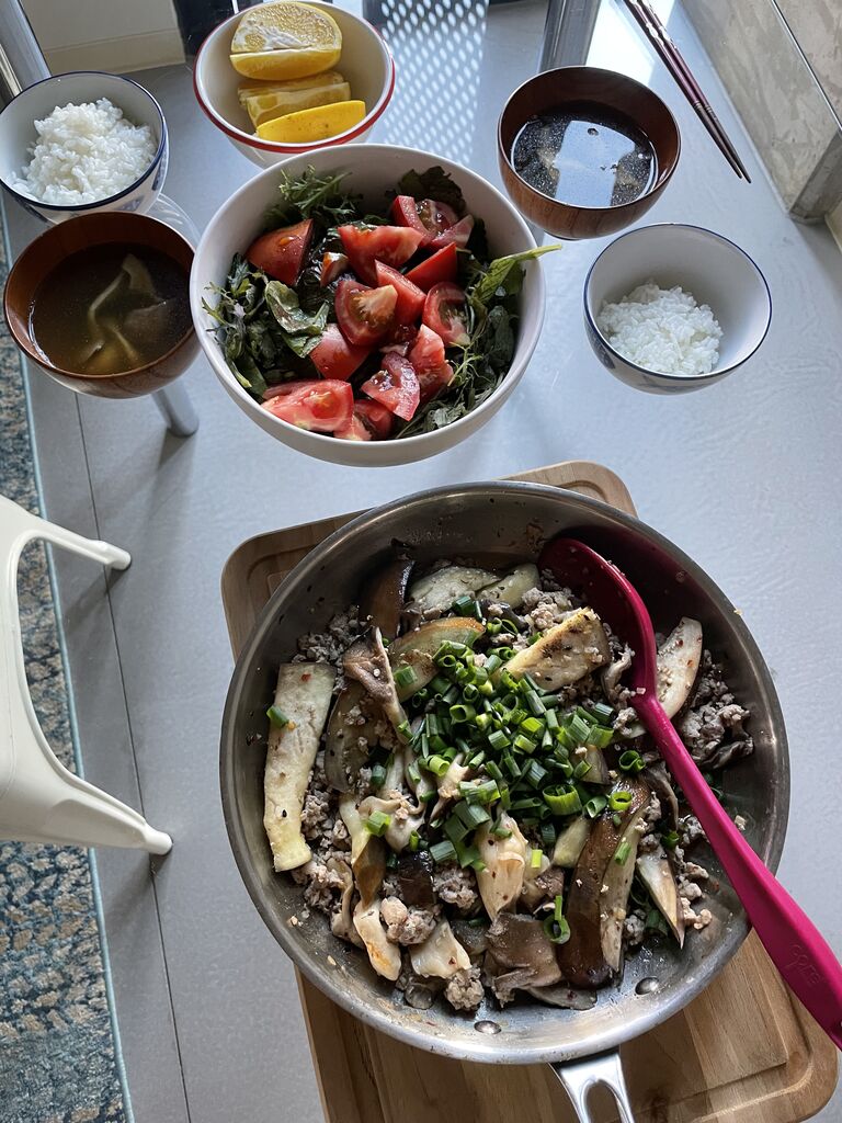 あと巨大ナスとキノコと豚ひき肉を炒めたやつ〜!