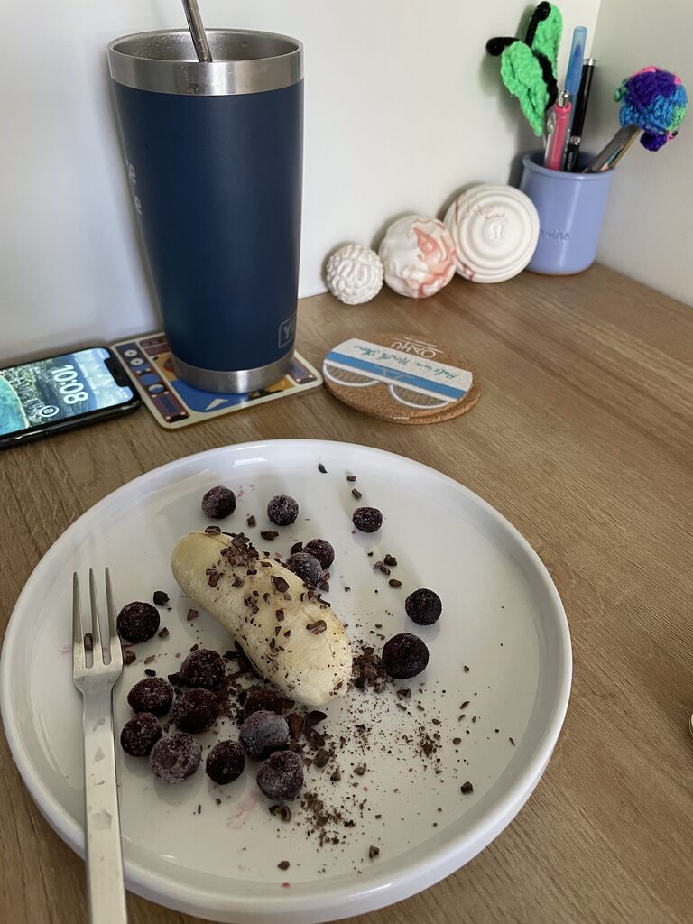 バナナとカカオニブ、冷凍ブルーベリーのおやつ。