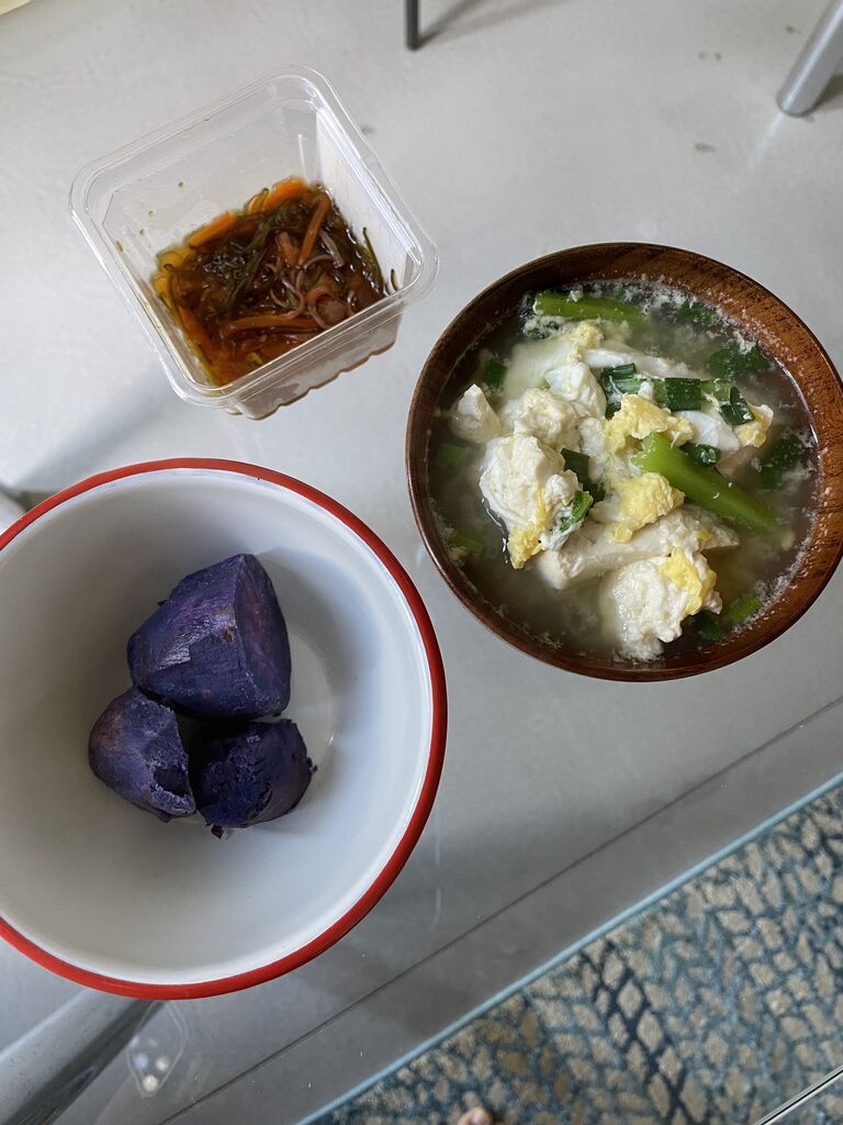 ランチは、豆腐と卵のチキンストックのスープと紫芋、松前漬け。