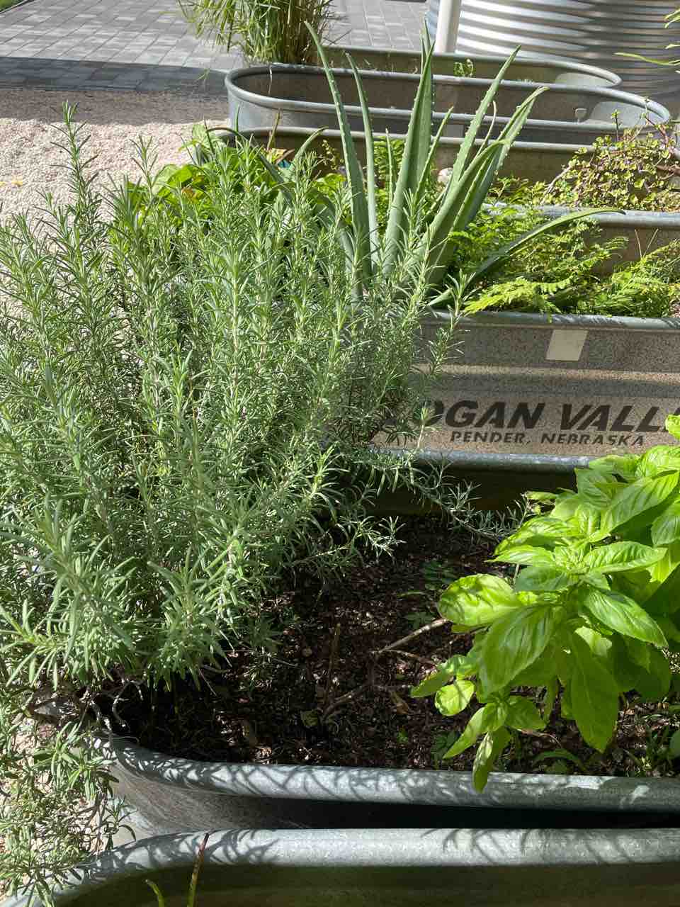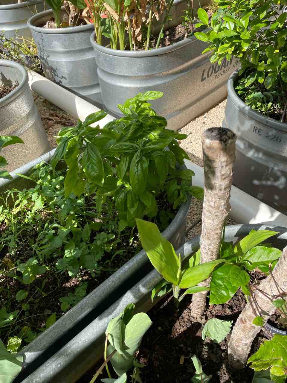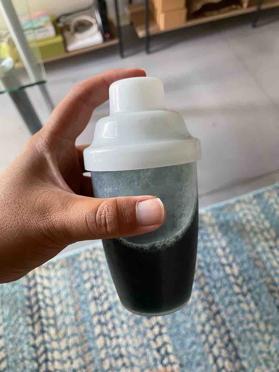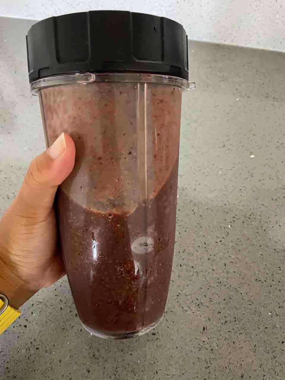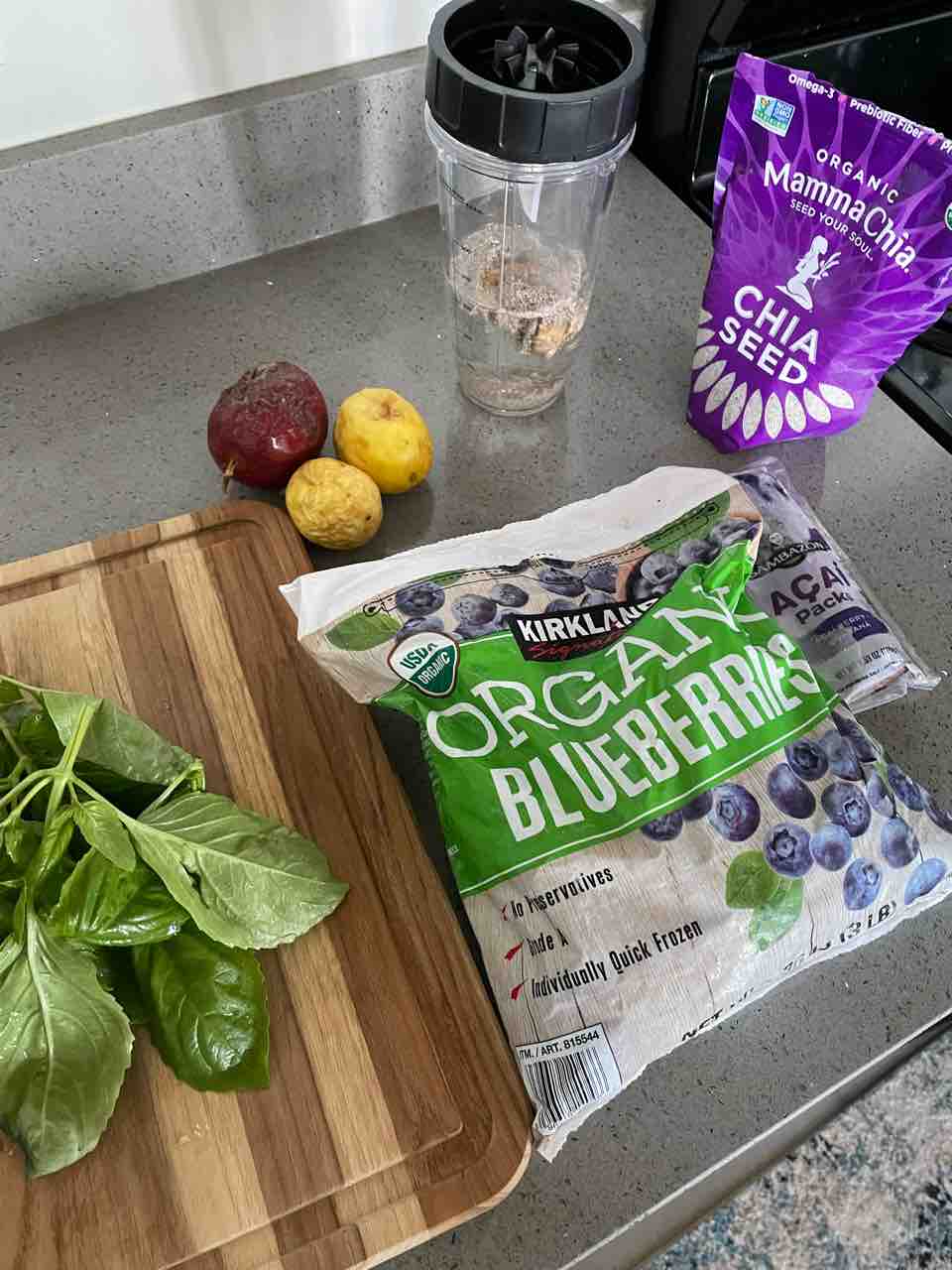 ガーデニングで摘んだバジルと、チアシード、生姜、ターメリック、ブルーベリー、アサイー!