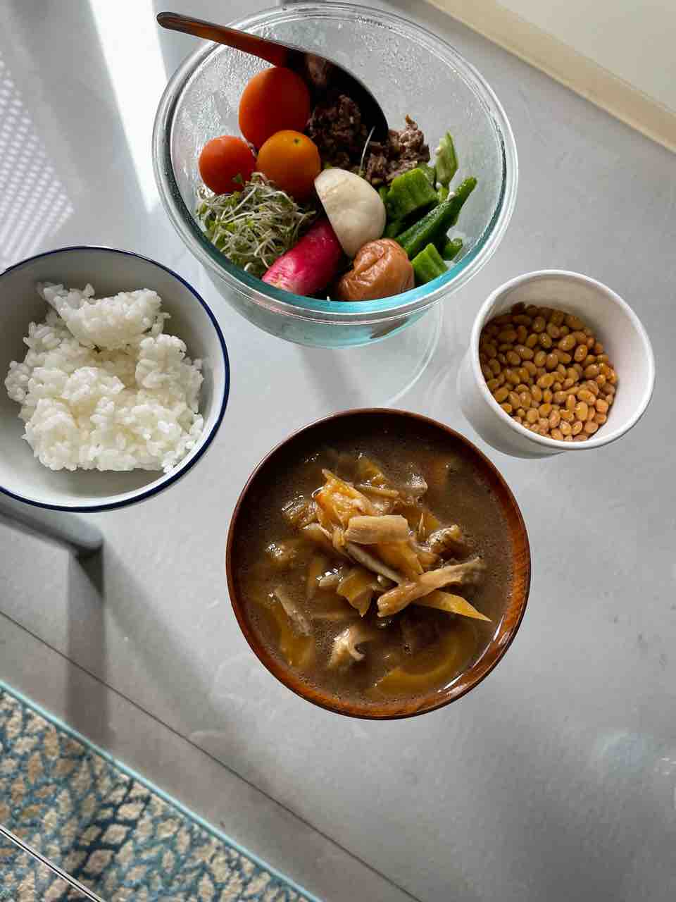 白米100g、ボーンブロスのスープ、納豆、野菜と鹿肉と糠漬けと梅干し!