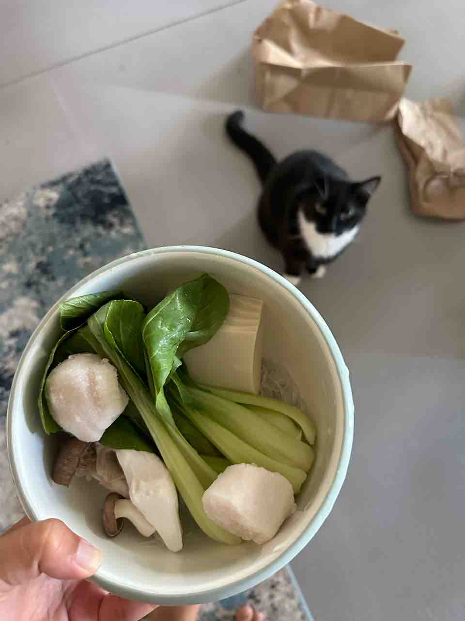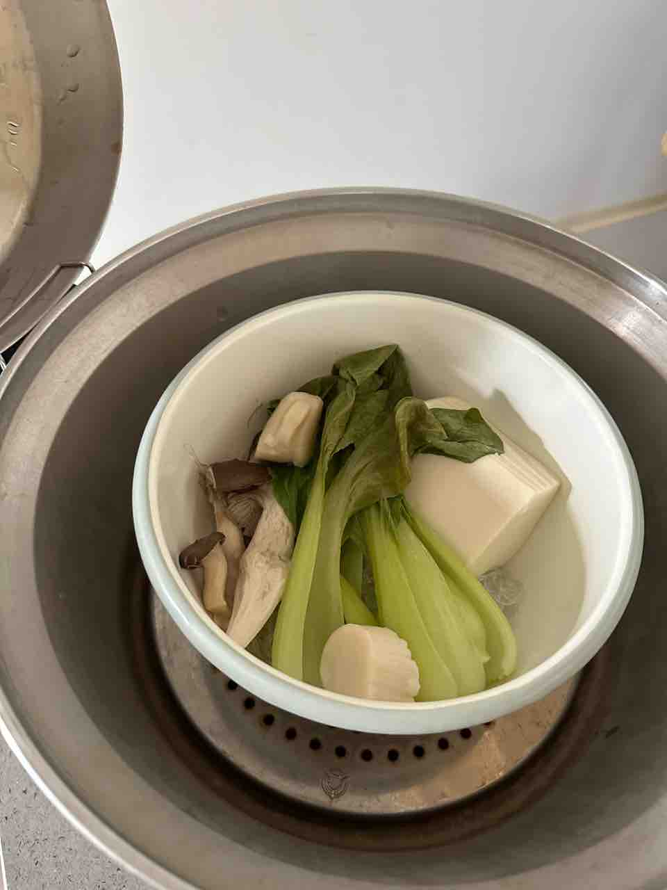 水で戻してから、豆腐、ホタテ、キノコと青梗菜を載せて