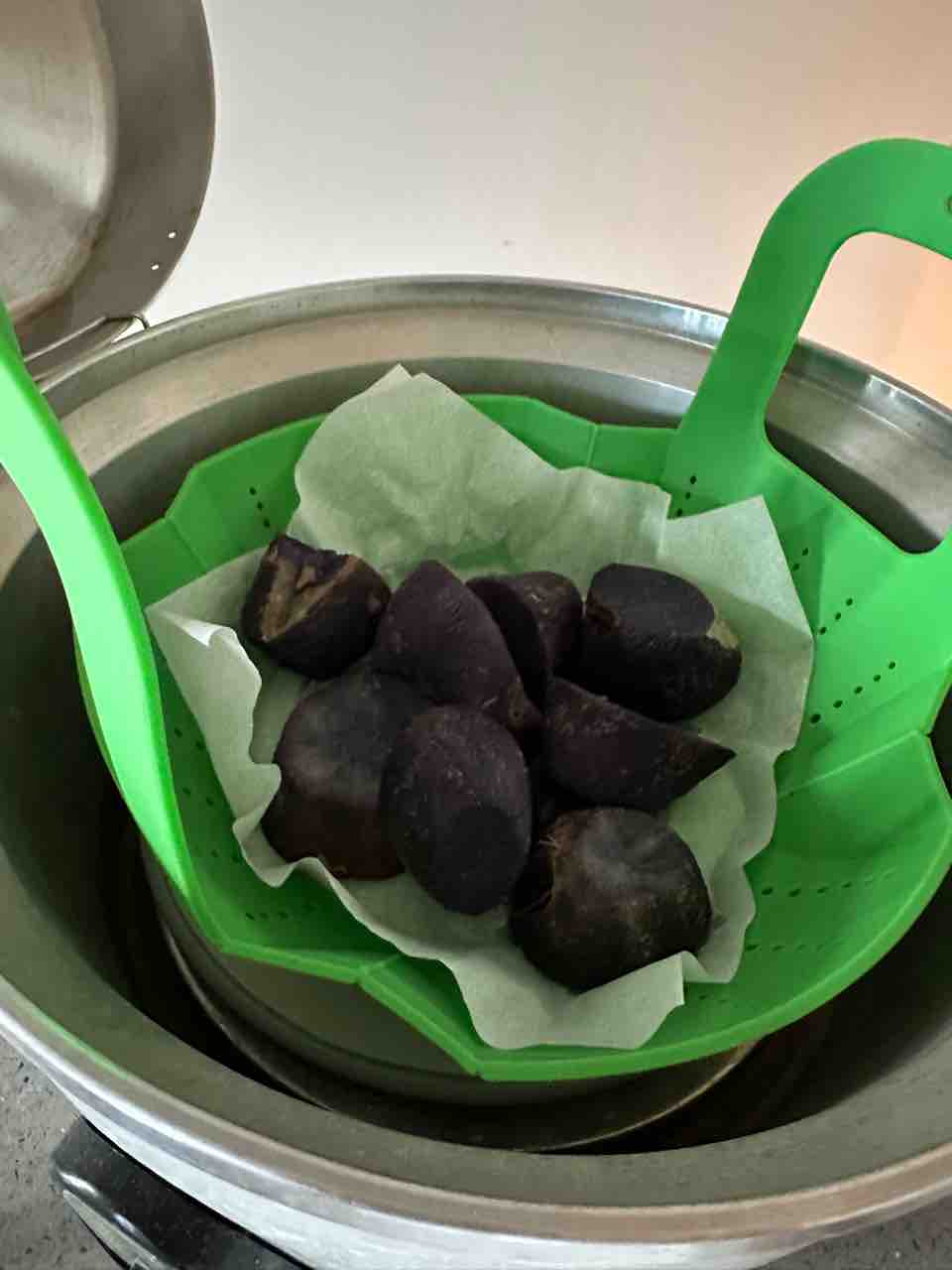 紫芋を蒸して冷やしておこうと思って(冷やすと甘味増す!)蒸して、結局つまみ食いもして