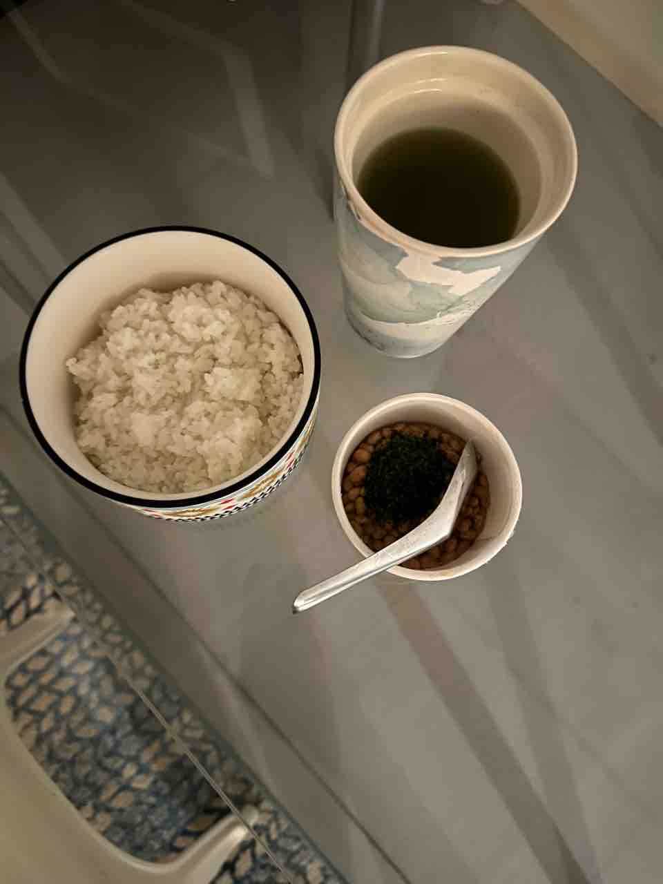 朝は白米に、納豆・オリーブオイル・藻塩・青のり。緑茶と。
