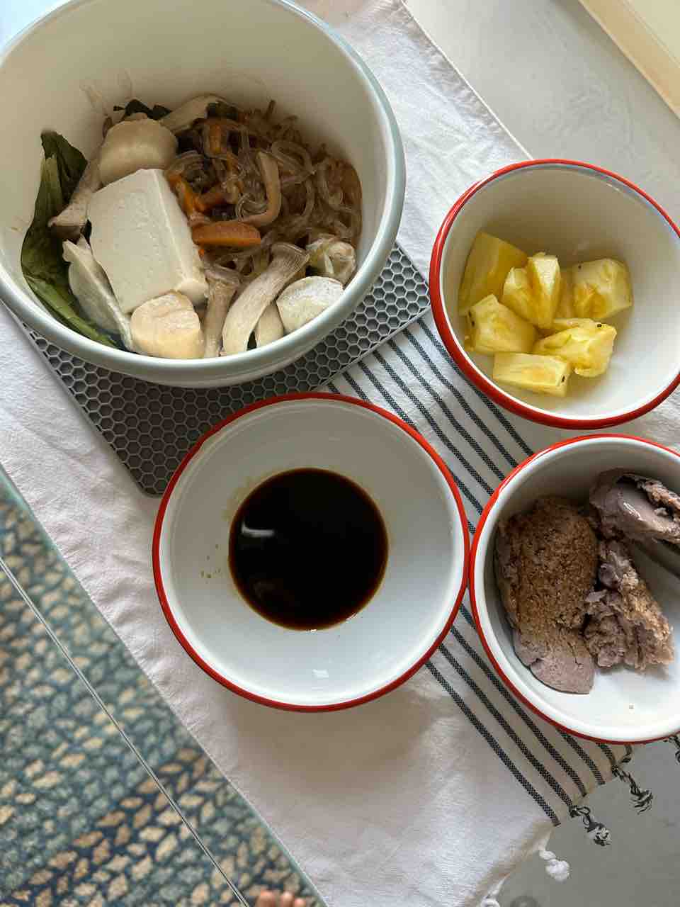 ランチは、レタスと豆腐、エリンギ、チャプチェ、ホタテを蒸したやつとポン酢。